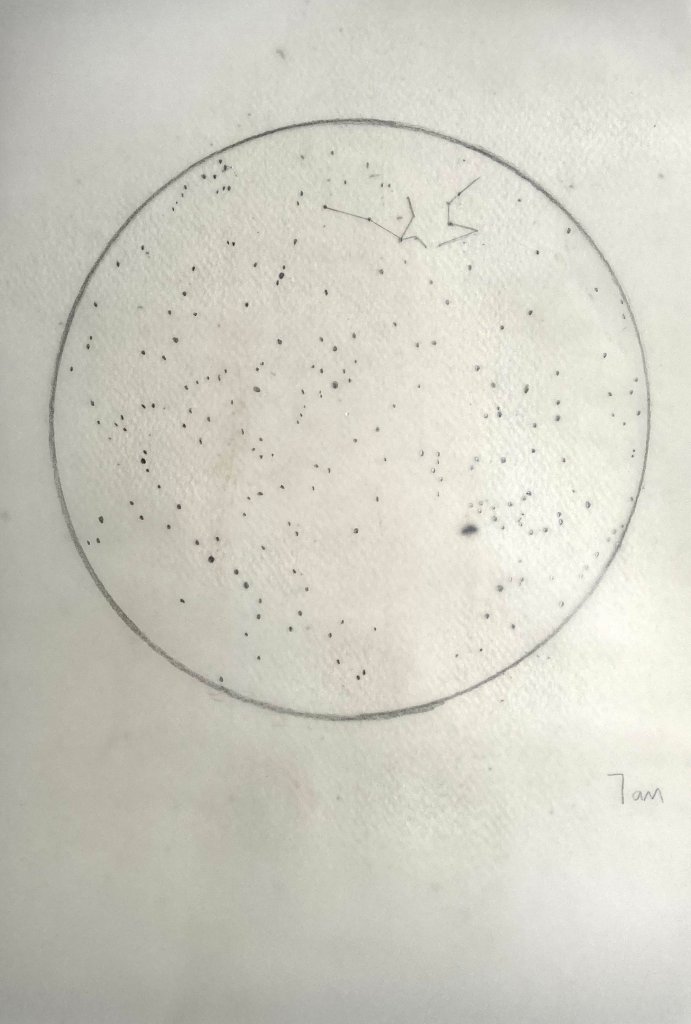 “Ignoring the other stars I traced the path of Aquarius on the day he died. It left the sky around the time I’d figured he must have gone. With the agreement of constellations, I set the first starscape on a sheet of plant pigment to expose.”